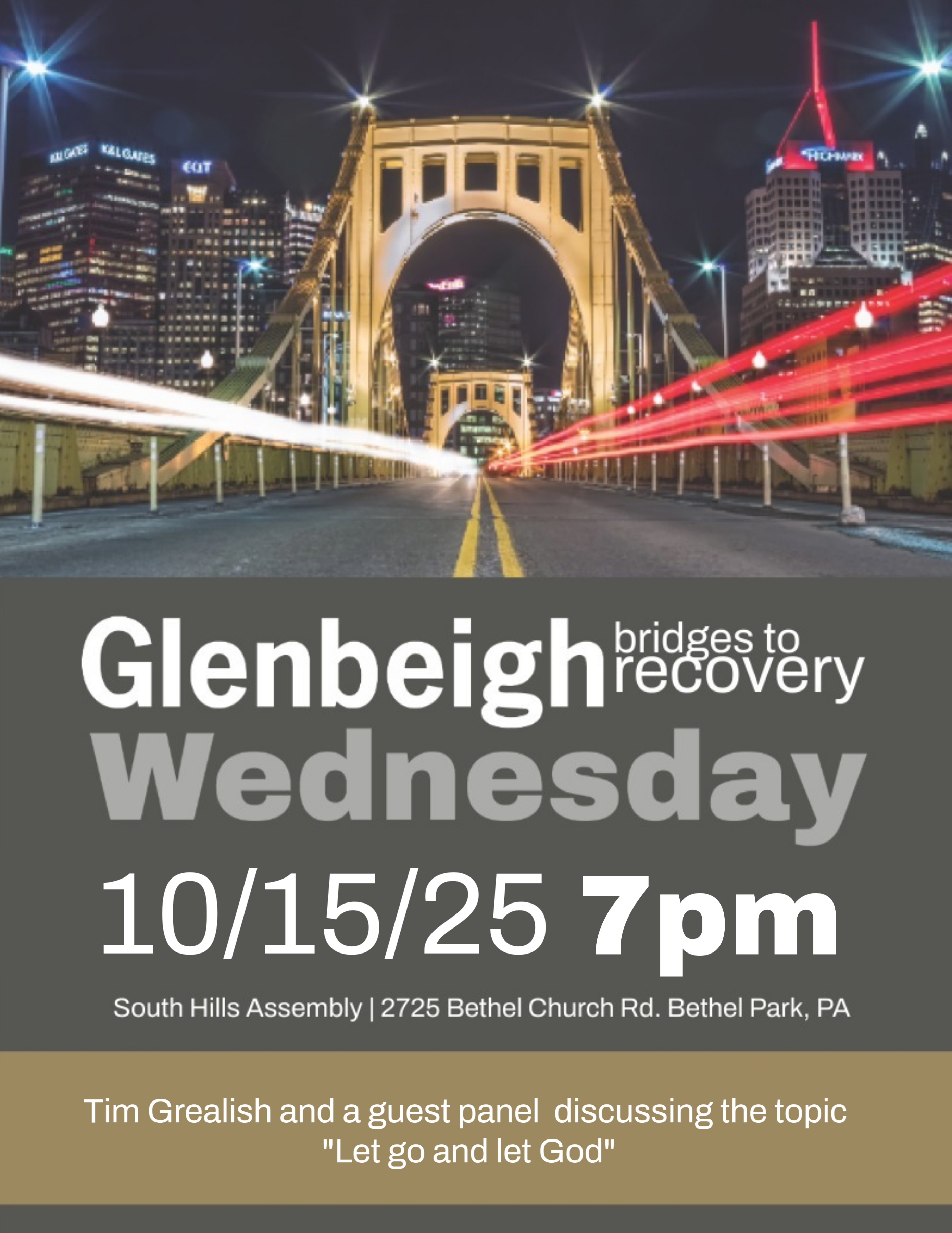 Anyone in recovery, or who loves or supports someone in recovery, are welcome to attend Glenbeigh's Bridges to Recovery meeting at 7:00 PM, Wednesday, October 15, 2025. Various speakers will share on the topic of "Let Go and Let God". Event is hosted by Tim Grealish.